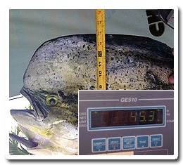 - The wininng dolphin was 45.3 lbs and the head measures at 14" overall length 59".